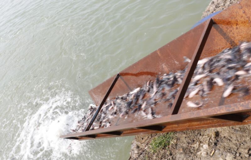 經過多年放流,如今放流作業已十分專業且迅捷,除放流展示環節外,其余放流行動則是將魚苗運輸專用車盡量靠近河邊,然后將車上連接出口通過鐵制水槽及塑膠管袋接入河中,待打開閘閥,魚苗則隨水流通過水槽及管袋直接進入淮河。這樣不傷魚苗,成活率高,也提高放流效率。