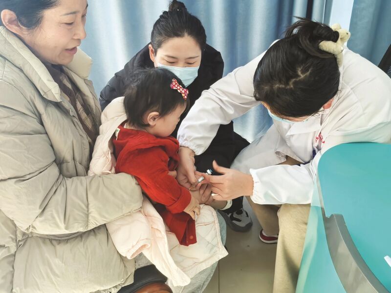 (記者 蘇國義 攝影報道)2月13日上午,經過前期預約,李女士帶著不滿一周歲的女兒在淮南高新區弘湖社區衛生服務中心完成了針對嬰兒呼吸道合胞病毒“尼塞韋單抗”注射液的注射。