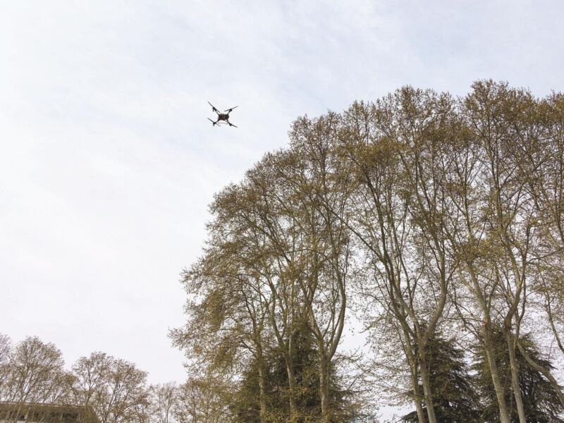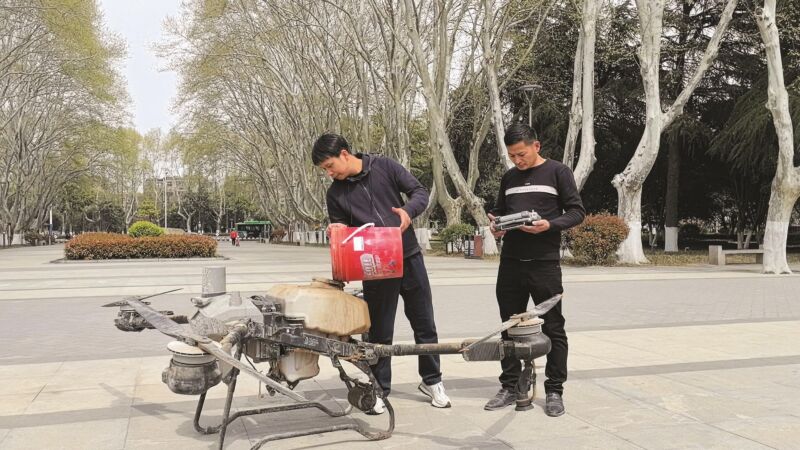 (記者 廖凌云 攝影報道)春日的淮南,法國梧桐(學名:懸鈴木)漸抽新芽,卻也暗藏“美麗的煩惱”——每年五六月,主城區4500棵法梧的果毛隨風飛舞,形成惱人的“梧桐雨”。3月31日中午,洞山公園上空傳來陣陣嗡鳴,一架無人機騰空而起,向30米高的梧桐樹冠噴灑生物抑制劑,以抑制花芽分化,減少果球數量和飛絮飄散。
