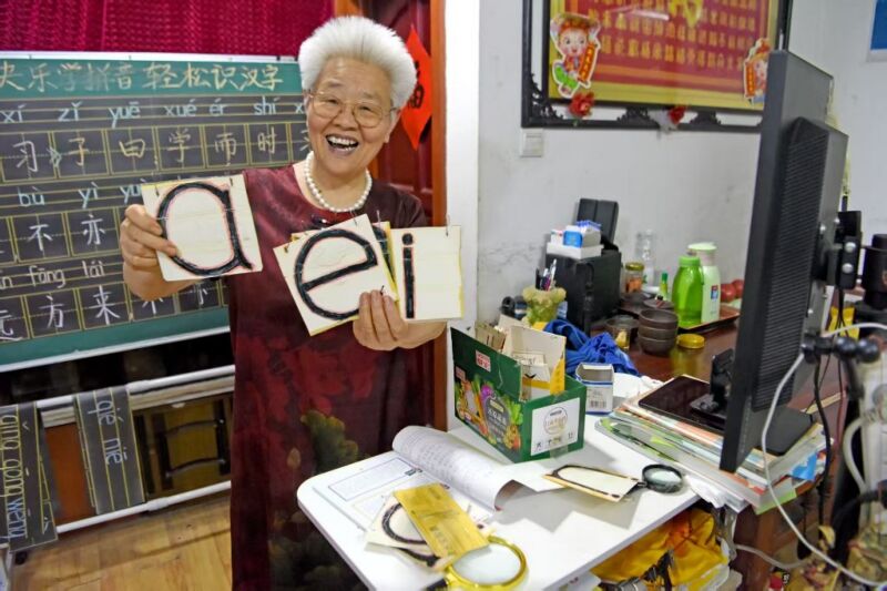 “當時看到很多年輕人玩短視頻,我就想,能不能用這個教拼音?”楊維云撫摸著陪伴她多年的小黑板說。起初,一個簡單的教學視頻要反復錄制幾十遍,“眼睛老花看不清手機,手指也不靈活,但想到可能有人需要,就堅持下來了”。