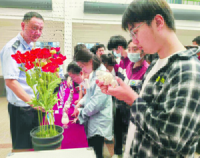 “這個顏色鮮艷的小藥丸是什么?”“像郵票又像貼畫的也是毒品嗎?”同學們圍攏在展示區,近距離仔細辨識著海洛因、冰毒、大麻、毒蘑菇等仿真毒品樣品,驚訝聲此起彼伏。仿真罌粟花靜默綻放,美麗的外表下暗藏致命毒源,無聲警示著它的危險本質。當禁毒宣傳警官揭開這些“糖衣”偽裝,揭示其成癮性和破壞性時,一張張青春的面龐上寫滿了凝重與震驚。“原來它們離我們這么近,偽裝得這么像普通零食飲料,太有欺騙性了!”高二學生朱道傲男盯著毒蘑菇樣品,語氣里滿是警惕。