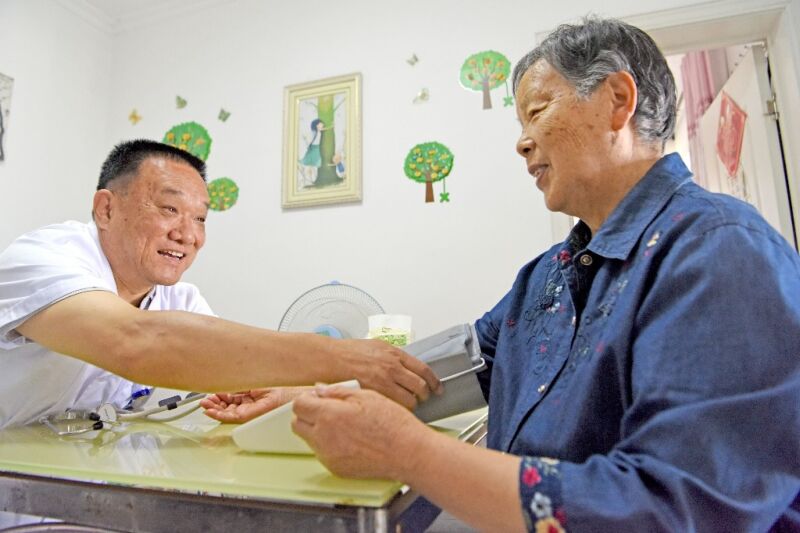 圖二:淮南高新區三和鎮弘湖社區醫生志愿者為83歲郭軍老人測量血壓,開展健康回訪。