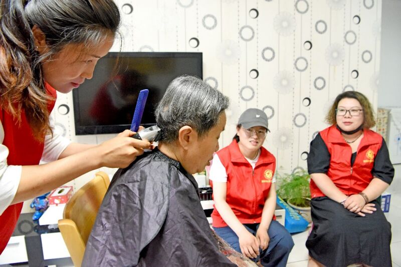圖三: 謝家集區平山街道瑞安社區志愿者錢月娥(左一)為腰部摔傷的陳凡珍老人上門義務理發。