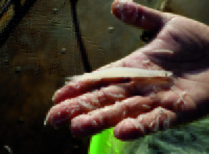 記者跨上銀魚捕撈船,盆桶中盛滿銀魚,間雜小魚需仔細分揀。面對細小銀魚,漁民先將撈獲物置入盛水大盆,再用撈罩篩出銀魚,剔除水草和雜質。隨后,潔凈的銀魚被移入干凈器具,加冰后冷藏保鮮,不久便送入市場。
