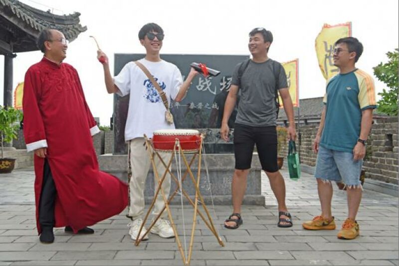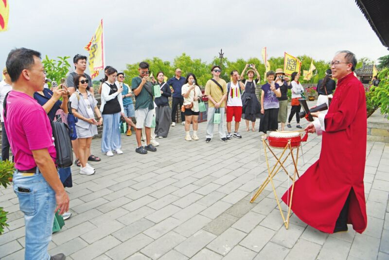 馬來西亞入境旅游團游客在壽縣古城欣賞非遺項目壽州大鼓表演。