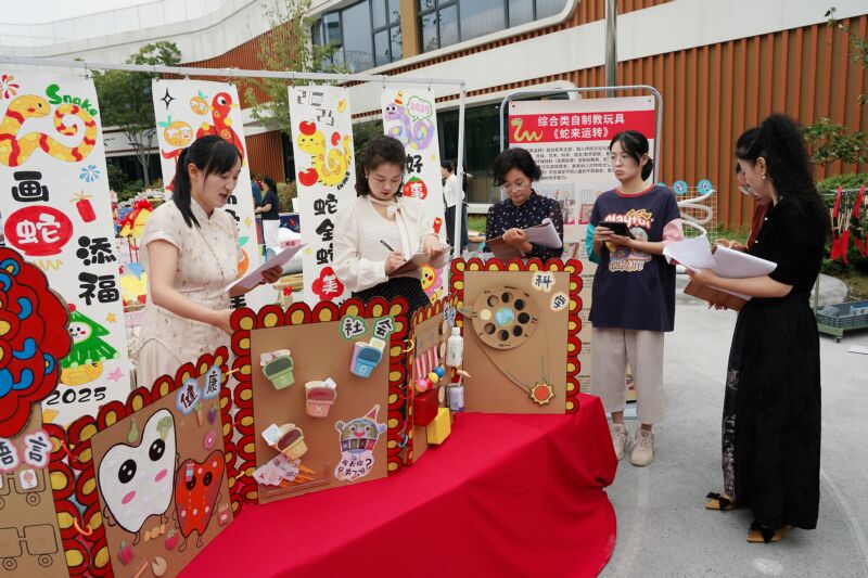 近日,2025年淮南市幼兒園優秀自制玩教具展評活動現場賽在淮南高新區中心幼兒園杜鵑路總園舉行。本次活動由市教育體育局裝備中心主辦,200余名教師帶著83件參評作品齊聚一堂,涵蓋綜合類、運動類、益智類、科學類、建構類、藝術類六大類別。教師們利用日常生活中的常見材料,精心制作出一件件新穎獨特、玩法多樣、美觀實用的教玩具作品,充分展現了幼兒教師的創新智慧與教育匠心。