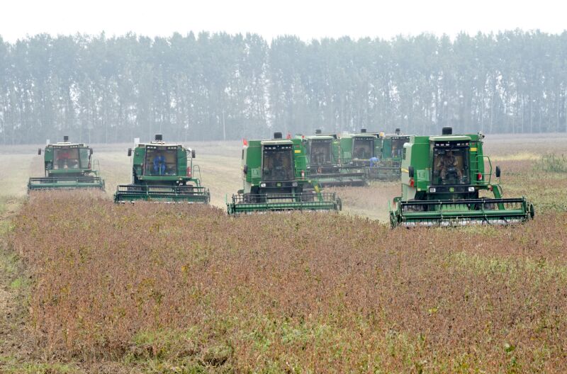 針對近期陰雨天氣對秋糧收獲帶來不利影響,我市加快秋糧搶收搶烘進度,確保秋糧豐收到手。圖為10月11日,省農墾集團壽西湖農場有限公司組織機械搶收大豆。