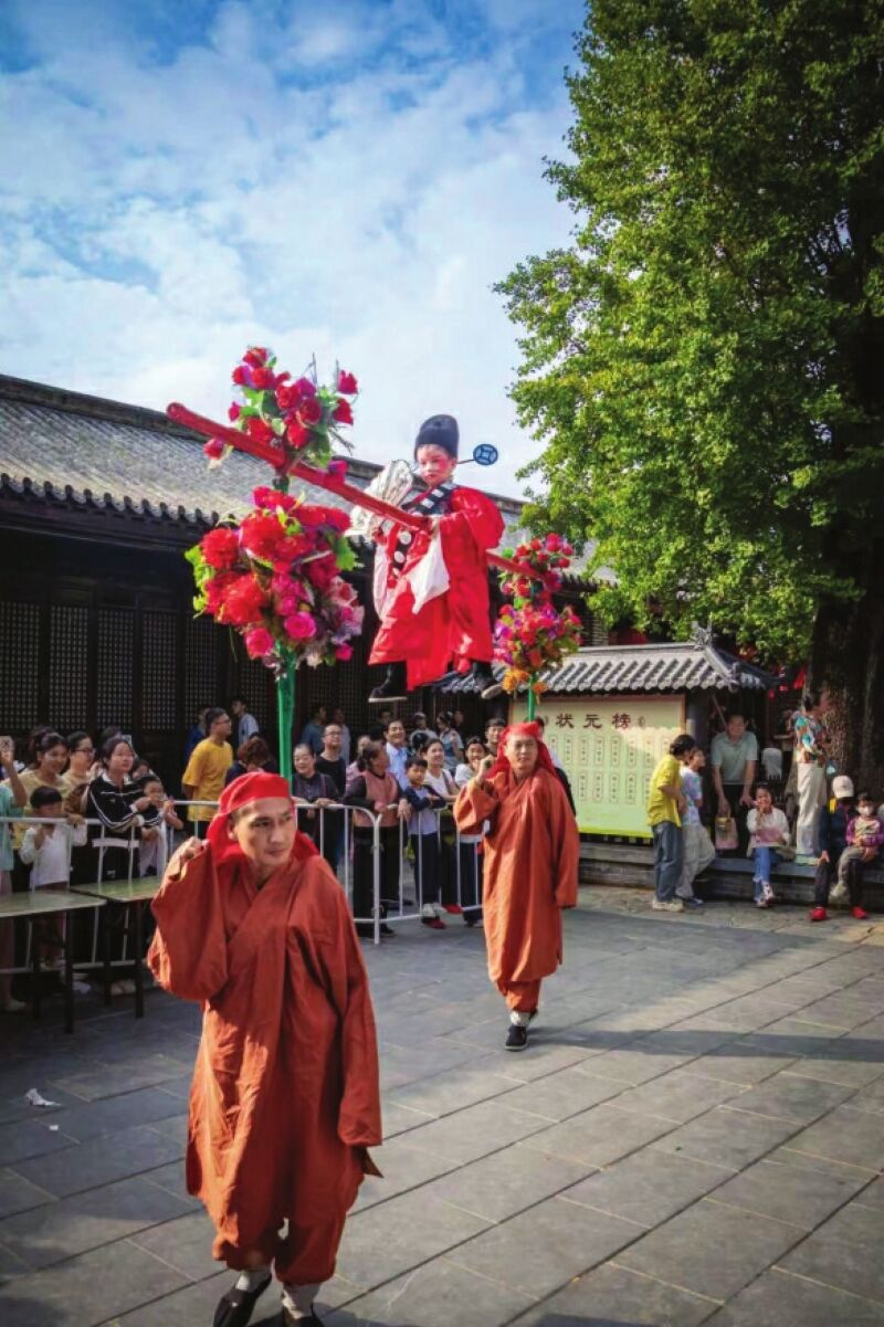 現場,抬閣與肘閣輪番亮相。肘閣上,小演員扮成傳統戲劇人物,在成人頂托的鐵架上輕搖慢擺,盡顯“空中芭蕾”之美;抬閣則由多人抬行,各色人物造型傳遞祈福寓意,被譽為“肩膀上的戲臺”。