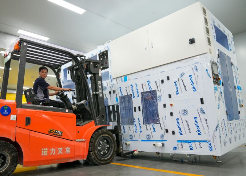位于田家庵經開區(北區)的科沛達半導體(安徽)有限公司),專注于半導體濕法類及相關自動化設備的研究、設計、生產、營銷、安裝與服務,主要產品有槽式(Wet Bench)或單片(single wafer)濕法制程及相關自動化設備,主要服務類型涉及半導體材料、功率器件、IC制程、化合物半導體、光通訊、LED、MEMS等。公司生產基地于2023年11月份正式開工建設,今年6月份開始投入生產。圖為在科沛達半導體(安徽)有限公司車間里,工人正用叉車搬運即將交付客戶的產品。