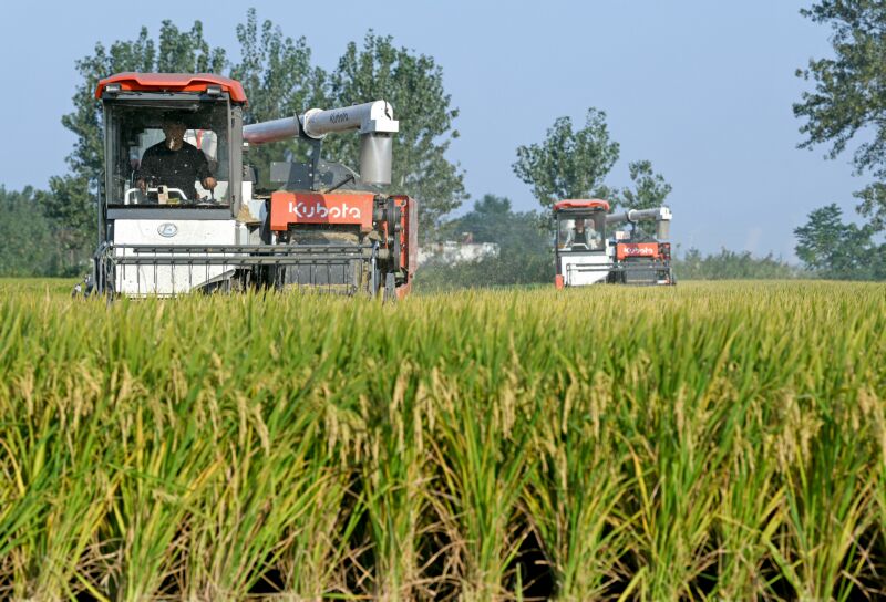 10月22日,雨后初晴,鳳臺縣岳張集鎮六院村種糧大戶徐懷彪組織機械搶收水稻。針對近期連續陰雨天氣對“三秋”生產造成的影響,淮南市堅持搶字當頭,科學統籌調度,全力以赴搶收搶烘水稻,搶抓農時壓茬推進秋種。