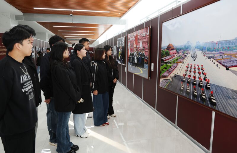 10月27日下午,由新華通訊社主辦,新華社安徽分社、中共淮南市委等共同承辦的“國社之鏡·世紀光影之人民必勝”藝術展淮南展在淮南高新區文化發展中心開展,并免費對市民開放。展覽用140余張珍貴歷史照片,以宏大的歷史視野、珍貴的檔案影像、深刻的精神內核,全面再現中國作為世界反法西斯戰爭東方主戰場的壯烈史詩。圖為淮南職業技術學院的學生在觀展。