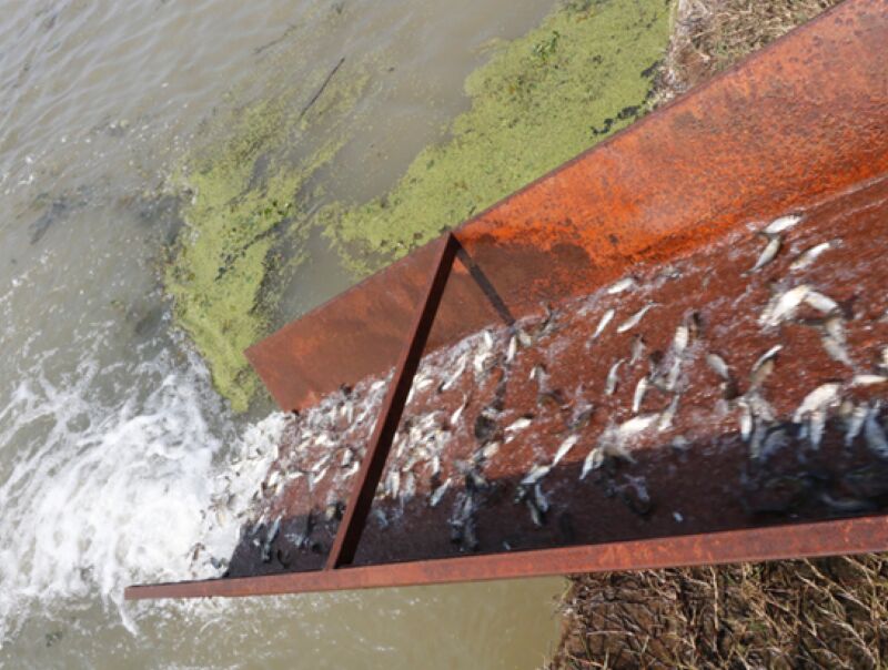 淮南從2008年開始在淮河水域開展增殖放流,經(jīng)多年放流,如今放流作業(yè)已十分專業(yè)且迅捷。除放流展示環(huán)節(jié)外,其余放流行動則是將魚苗運輸專用車盡量靠近河邊,然后將車上連接出口的管袋通過鐵制水槽接入河中。隨著閘閥的開啟,水流沖出,魚兒沿著槽道躍入河水之中。這種方式既保護魚苗,確保成活率,又提升了放流效率。