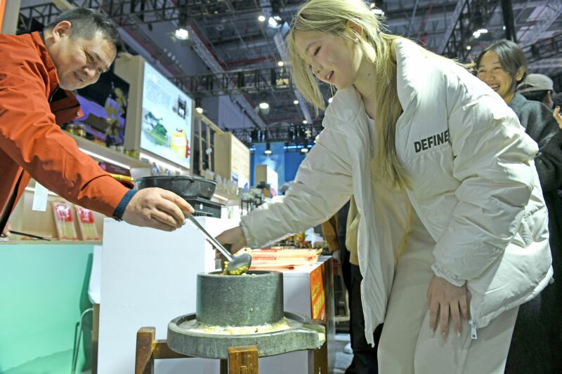觀眾在安徽八公山豆制品有限公司展位體驗傳統豆腐制作技藝。