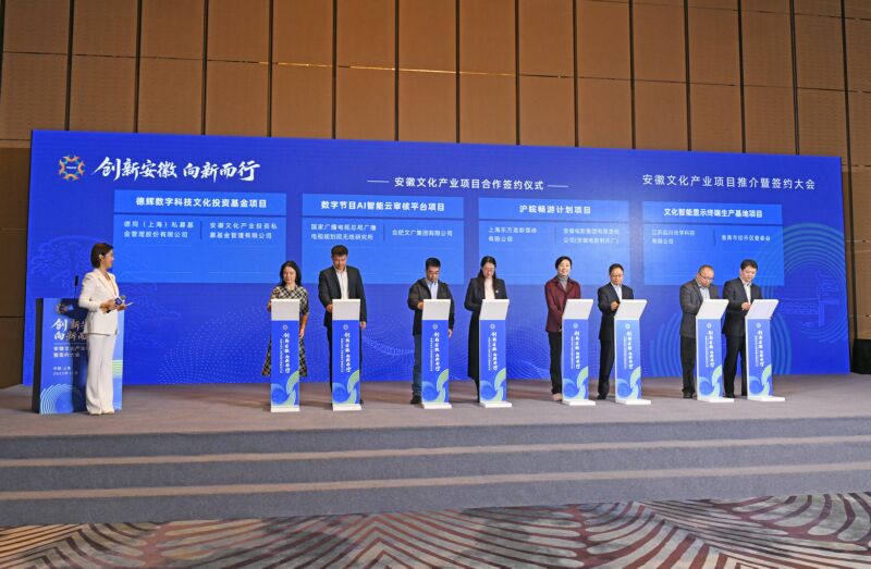 安徽文化產業項目推介暨簽約大會現場,總投資1.45億元的文化智能顯示終端生產基地項目成功簽約。