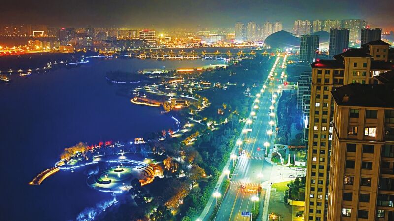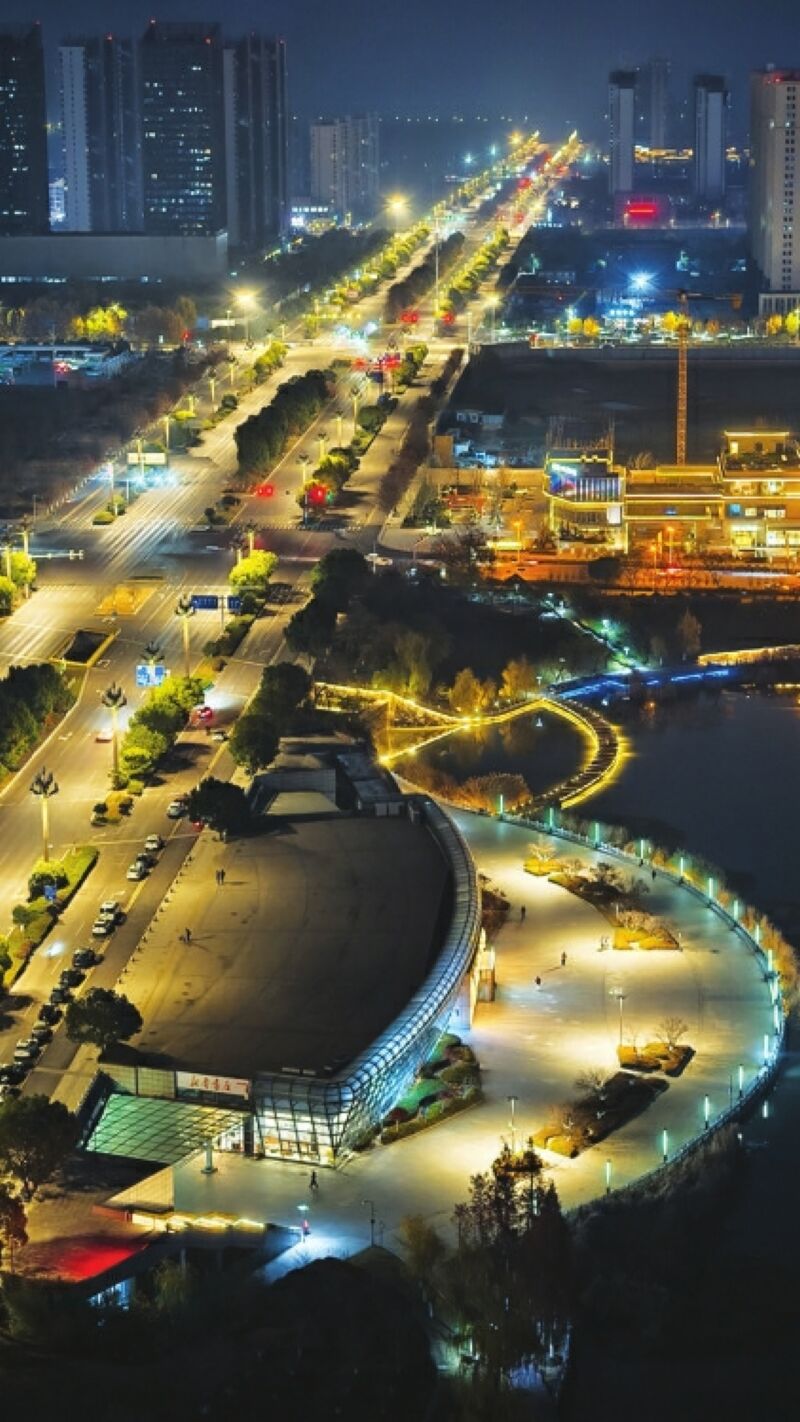夜幕降臨,車流蜿蜒,璀璨的燈光在樓宇間流轉、在街道上延伸,交織成熠熠生輝、星光點點的銀河帶,將夜空與大地溫柔相連,一輪紅月相映,盡顯都市夜景的繁華與浪漫。