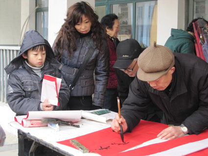 上午還不到9點,得到消息的居民們就紛紛來到了社區服務中心門前,不多時,洞山新村社區以及社區的和諧共建單位淮南市統計局的書法愛好者也來到這里,十幾位書法愛好者磨好墨,拿起筆,便開始了剛勁有力的書法創作。記者在現場看到,每當有一位書法高手寫完,臺下便紛紛鼓掌吶喊,并紛紛舉手要求將對聯贈與。