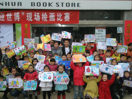 “海寶游龍湖公園”、“海寶橫渡淮河”、“奧運五福娃與海寶”……看著一張張以上海世博會為主題構(gòu)思精巧的兒童畫,人們不禁驚嘆孩子們天真浪漫的想象力。3月27日上午9時許,我市50名兒童齊聚泉山新華書店門前,參加“百只小手迎世博”少兒現(xiàn)場繪畫比賽,為即將到來的上海世博會送去了一份份純真的祝福。