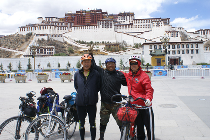 5月31日,3位“騎士”在墨竹工卡出發,向前翻過一個山頭的時候,巍峨的布達拉宮突然出現在他們面前!4200公里,這是他們自行車里程表上顯示的數字,13座,這是他們翻過海拔4000米以上高山的數字。經過52天翻山越嶺的跋涉,他們終于到達了拉薩,那一刻,3位“騎士”們激動得久久不能平靜。