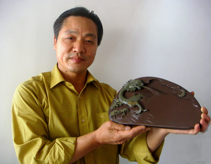 圖:這方就是胡華勇雕刻的《青龍出海》紫金硯。