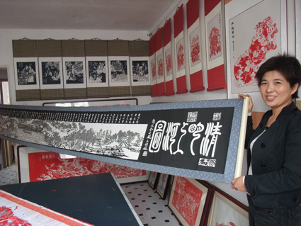 10月18日,在淮南田家庵龍泉村的一間房子里,記者看到了屋里貼滿了鮮艷奪目,風格各異的剪紙作品。在靠墻角的一邊,還有幾幅巨大的,已經(jīng)裝裱完成的剪紙作品。看到這些作品,很難讓人想象到,這竟是用一把剪刀和一張整紙完成的,其難度和復雜令人贊嘆不已。張傳錦正忙著手頭的事情,她身材不高,面目清瘦,留著短發(fā),給人以文靜而精力充沛的印象。據(jù)她介紹,10月初,她接到了安徽省工藝美術學會的邀請,讓她和自己的學生王文軍將作品送去參加“文博會”的精品展,10月14日,他們將作品送至合肥。15日,她從上海趕到合肥,參加“文博會”,等到“文博會”結(jié)束,她便匆匆趕回淮南。10月18日上午,她接到了安徽省工藝美術學會秘書長陶敬福的電話,得知自己的剪紙作品《清明上河圖》獲得了金獎,而王文軍的《四季平安》則獲得銀獎。聽到這消息,張傳錦不禁喜出望外。她告訴記者,剪紙長卷《清明上河圖》,長7.9米,寬0.5米,歷時3年剪成,是她最得意的作品之一。學生王文軍跟她學剪紙已有七八年,其作品多次在全國剪紙大賽上獲獎。
