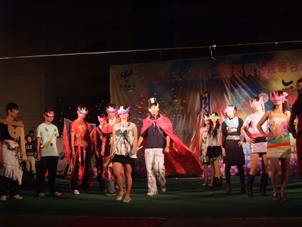 晚7點整,面具化裝舞會準時開幕。整場晚會共分為神秘舞園、青春嗨舞、漫舞天下三個章節。開場舞《愛之舞動》為觀眾表演了莊重典雅、舒展大方的華爾茲圓舞,演員們青春的姿態、燦爛的笑容、華麗的裝扮,給大家留下了深刻印象。在接下來的節目中,安理大學生樂隊的《亡靈序曲》、淮南師范學院熱舞團傾情演出的《Set up》,以及吉他彈唱《天使的翅膀》等歌曲串燒,都贏得了在場觀眾的熱烈掌聲。最讓人叫絕的節目是大型時裝表演《我型我秀》。不同于以往的時裝走秀,演員們以環保為理念,通過大膽想象和精心設計,將收集起來的廢舊報紙、易拉罐、塑料布、舊光盤甚至舊風箏,改裝成了一件件樣式新穎、色彩鮮艷的個性“時裝”。同學們以這種十分巧妙的方式,告訴大家“地球是人類綠色的家園,珍惜地球就是珍惜生命。”