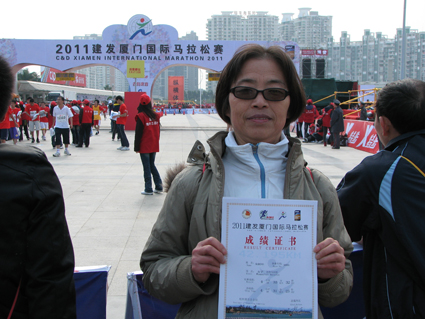 宋樹環在淮南市第三人民醫院理療科工作,同時她也是淮南馬拉松圈內一個小有名氣的業余選手,今年54歲。在2011年初結束的廈門國際馬拉松比賽中,她以4小時31分25秒的成績跑完全程,在跑完全程的1500多名女選手中跑出第150名的好成績。了解她的人都知道,這完全得益于她十幾年不間斷的跑步鍛煉,跑步不僅使她徹底告別了體弱多病,而且更讓她步入了健康幸福的軌道。