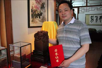 2011年5月26日至5月29日,由中國工藝美術行業協會主辦的2011工藝美術大師作品暨工藝美術精品博覽會在上海舉行,會展中淮南工藝師胡慶玖的作品——《紫金石印二龍戲珠》獲得大賽金獎。近日,記者采訪了剛從上海回淮的胡先生,他說:“此番到上海參加會展,最感欣喜是,隨著近幾年來紫金石屢屢拿下國內大獎,現在很多業內人士,都開始了解紫金石、欣賞紫金石、肯定紫金石。”