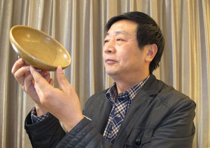 圖為崔懷倫先生和他的作品《仿壽州窯黃釉碗》。