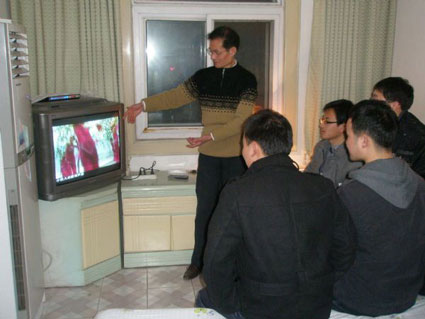 圖為熱愛推劇的高校學子正在教師家中收看淮南電視臺播放的推劇歌《五彩淮鄉好風光》。