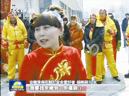3月1日上午,“央視星光大道”欄目組通過微博,向淮南的花鼓燈業余愛好者發出尋人啟示,說欄目組得知楊艷麗的夢想后,“火速商議決定幫助阿姨實現這個夢想!看到這個消息的網友們,快告訴阿姨,《星光大道》喊她來見‘畢姥爺’哦。”