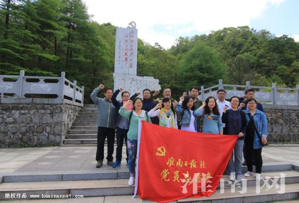 圖:淮河早報黨支部部分黨員志愿者在鷂落坪紅二十八軍軍政舊址紀念碑前重溫入黨誓詞