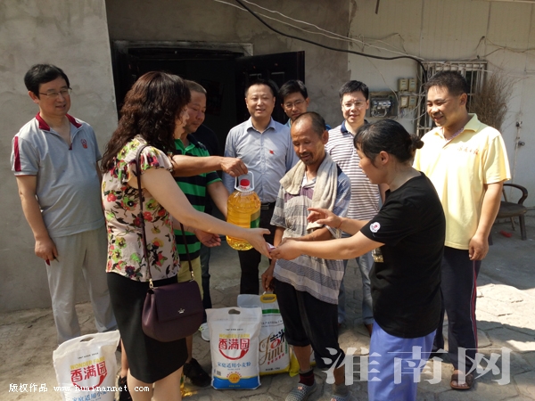 圖:淮南日?qǐng)?bào)社機(jī)關(guān)經(jīng)營(yíng)黨支部部分黨員將慰問(wèn)品和慰問(wèn)金交到孫玲和有福的手中。