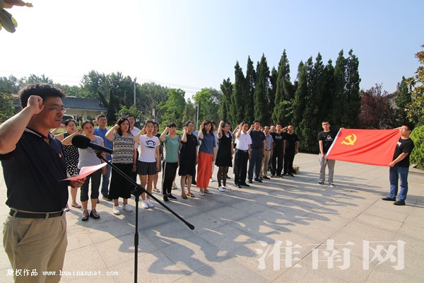 圖:淮南日報(bào)社黨員干部、編輯記者面向黨旗和革命先烈重溫入黨誓詞