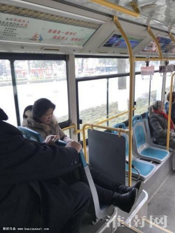公交車上,一人一位是每個人遵循的基本原則,可有些人卻對此視若無睹。自己有了座位,還不能讓腿受罪,給雙腿也找個地方休息。1月25日上午,一輛9路車上,一市民占著兩個座位,在玩手機。(記者)