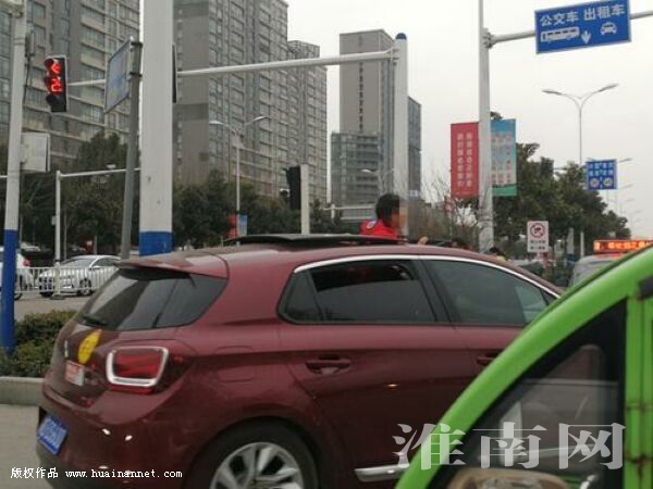 近日,淮河早報、淮南網記者在洞山東路路段看到,一輛紅色私家車在正常行駛過程中,車內一名男孩將天窗打開,半個身子探出窗外。而此時馬路上來往車輛非常多,行駛中將身體探出天窗十分危險,不禁讓人為其捏了一把汗。 (記者)