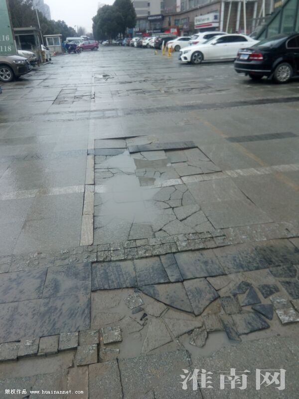 洞山新村居民吳女士向淮河早報、淮南網記者反映,近一年來,小區北面的尚錦廣場路面鋪設的地板磚,大半被過往的汽車碾壓破碎。最近一段時間的雨雪天氣,導致廣場上積滿污水,行人稍不注意,就會被污水弄臟衣服。(記者)