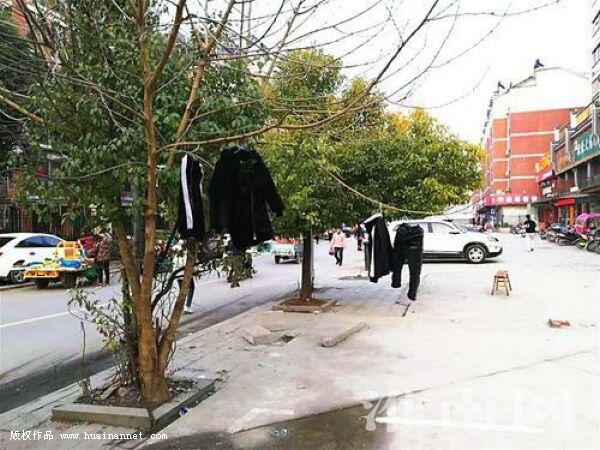 2月24日下午,田家庵春曉名城小區附近的馬路上,有人“借”行道樹晾衣服,“顫顫巍巍”的樹枝上掛了許多衣物,而原本向上挺直的樹枝隨著負荷的增加,也漸漸被壓低了頭。(記者 冉韜)
