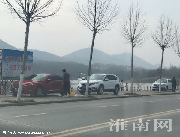 2月24日下午,淮河早報,淮南網記者途經林場路大通濕地公園,發現人行道上停了近10輛機動車,而車主們有的從湖里拎水,有的正在刷車,有的則把車上的腳墊放在樹上晾曬。(記者)