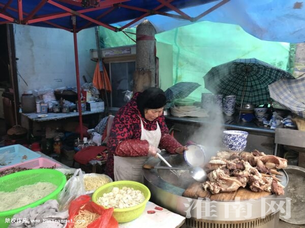 說起北菜市的回民飯店,很多出生于上個世紀60、70年代的淮南人都印象深刻,因為在他們的記憶中,那一碗碗鮮香濃郁、辣味十足的淮南牛肉湯最早就是從這里興起的。如今回民飯店早已不再,可具有淮南特色的牛肉湯小吃店卻在這里扎根下來,王菊林和其兒子就是其中的經營戶。王菊林告訴淮河早報、淮南網記者,她的公公婆婆最初就在淮南街頭經營小吃,后來國家推行合作化運動,就把他們這些回族人經營的小吃整合在一起,成立了“回民飯店”。“我們全家當時都在回民飯店里工作,我的公公是飯店里的廚師,二伯是飯店經理。大概是1960年左右,當時飯店里宰殺牛而剩余的牛骨頭和牛雜實在太多,飯店用不掉,扔掉又可惜,于是大家靈機一動,就想起用我們回民傳統制作牛肉湯的方法用大鍋熬牛骨,加入調料包,制作成湯,然后把煮熟的牛肉、牛雜切成薄片放入碗里再倒入滾燙的湯。”王菊林說,最初回民飯店的牛肉湯里并沒有加入粉絲、千張和豆餅這些輔料,當時大家只是把煮熟的牛肉或牛雜切成薄片,放到用牛骨頭熬制而成的湯鍋里燙一燙,撒上鹽和蔥花而已。而當時這樣一碗純牛肉的凈湯只賣到0.3元。后來隨著成本的上漲,加上牛肉湯口味過于單一,飯店又根據淮南人的口味,加入了具有淮南特色的豆餅,后來又加入了粉絲和千張。一直到現在,開滿街頭巷尾的各家淮南牛肉湯都延用這種方便而美味的制作方法,也深受廣大市民的喜愛,成為了享譽淮南乃至全國的特色小吃。”王菊林說道。