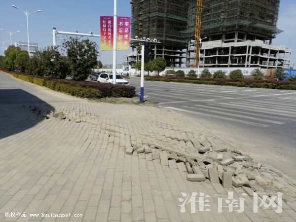 在春申大街與淮河大道交叉口西南角,有一段鋪設的地磚被車輛碾壓后,遭到嚴重破壞。不少地磚被壓斷、散開或翹起(如圖),影響到正常通行。(記者)