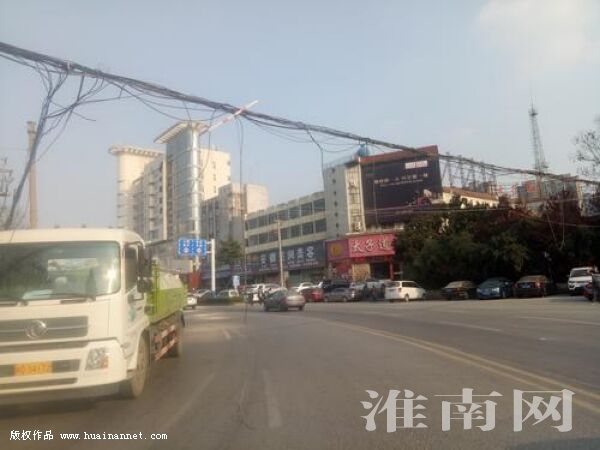 近日,淮河早報、淮南網記者途經舜耕路火車站附近時,看到有一段電線橫穿在路面上空,雜亂地交織在一起,還有幾段電線掉下,垂落在路中間,存在安全隱患。(記者)