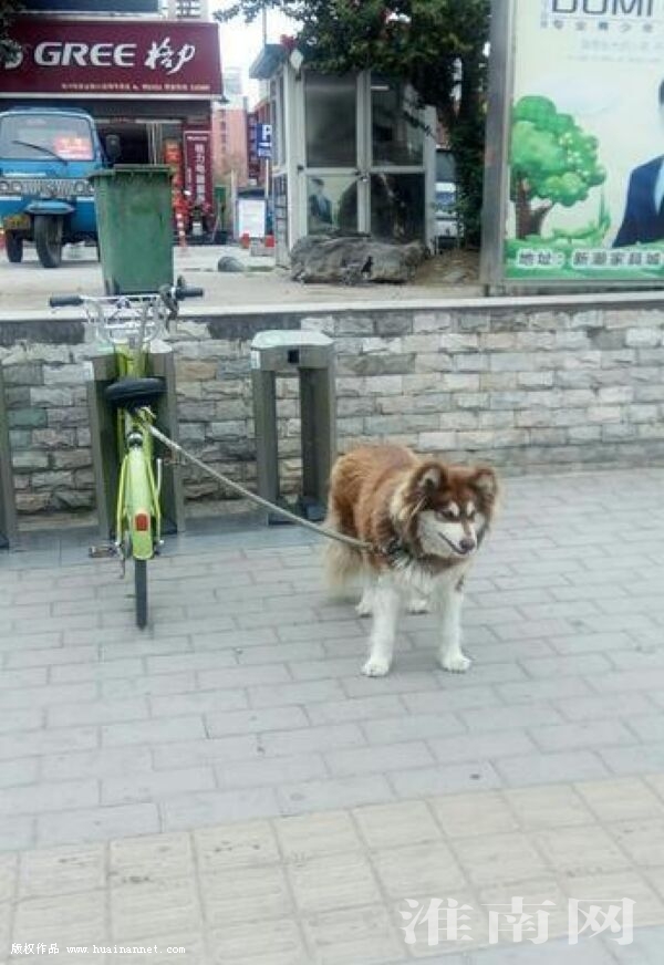 4月7日下午4時許,淮河早報、淮南網(wǎng)記者在淮舜路金色家園的“小綠”?奎c看到,一名男子將一條狗長時間拴在一輛單車上,導(dǎo)致這輛車無人敢取。(記者)