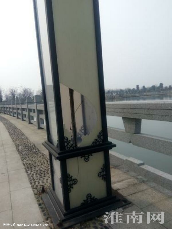近日,淮河早報、淮南網記者在山南中央公園看到,一些高約10米的景觀燈的玻璃燈罩破碎,導致燈罩內的燈管及電線裸露,景觀燈也因此失去了亮化的作用。(記者)