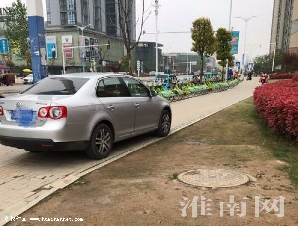 近日,在淮南實驗中學(xué)山南校區(qū)門口,臨近下午放學(xué)時分,有輛小轎車停在學(xué)校門口的人行道上,阻礙師生和家長通行。(記者)