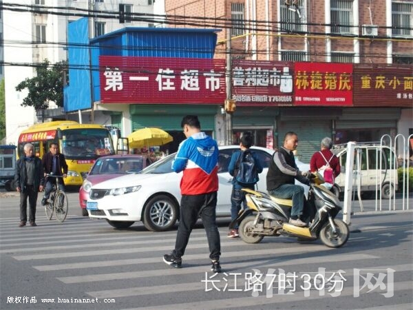 與此同時,7時30分左右,另一位淮河早報、淮南網記者來到潘集區白云小區和藍天小區之間的路口,這條位于長江路的路口劃有斑馬線,對面便是金荷小區,由于小區集中,金荷小區附近還有幼兒園,因此這條斑馬線穿行人數較多。而長江路是主干道,也是淮潘公路的一部分,車流量大,交通繁忙,車輛保持一定車速。淮河早報、淮南網記者看到,雖有斑馬線,但過往車輛卻視而不見,不見減速,不見禮讓。如此車不讓人,人只好讓著車,直到一陣車流過后,行人才急忙穿過馬路。