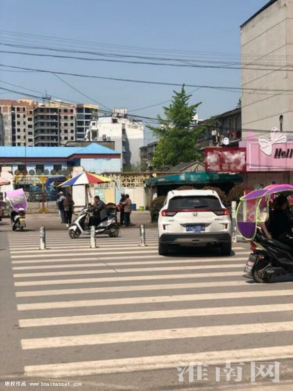 4月17日,淮河早報、淮南網(wǎng)記者在潘集區(qū)黃山路上看到,一輛白色CRV直接從間隙較大的兩根隔離樁之間穿行到了馬路對面。(記者)