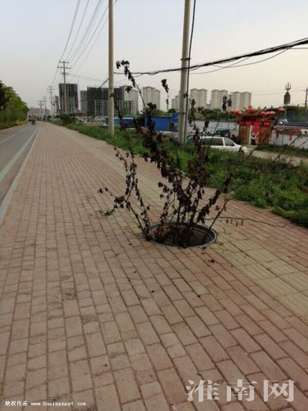 在高新區青桐大道西側,蒙淮風情園附近,人行道上有一處窨井蓋缺失,近一米深的窨井竟用樹枝插在井口(如圖),不僅影響城市形象,更存在安全隱患。不知這種情況要持續到什么時候,希望相關部門及時將窨井蓋補上。(記者)