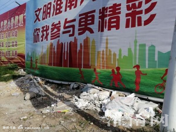 在民惠街西段泉山湖小區附近路邊,存在偷倒建筑裝修垃圾現象(如圖),且垃圾越來越多,與一旁的文明宣傳形成強烈反差,希望相關部門加強管理。(記者)