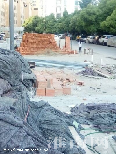 中都華府居民向本報熱線反映,一家施工單位將大量的裝潢材料胡亂堆放在他們小區內的一條人行道上,完全將人行道堵住,導致行人無法通行。(記者)