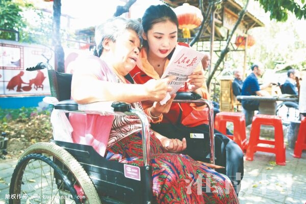 近日,大通區委宣傳部、區文明辦、區婦聯聯合組織30余名愛心志愿者走進桃源居老年公寓,義務為老人理發、打掃庭院、清理垃圾。圖為志愿者為老人讀報。(記者 陳海濤 編輯 湯寧)